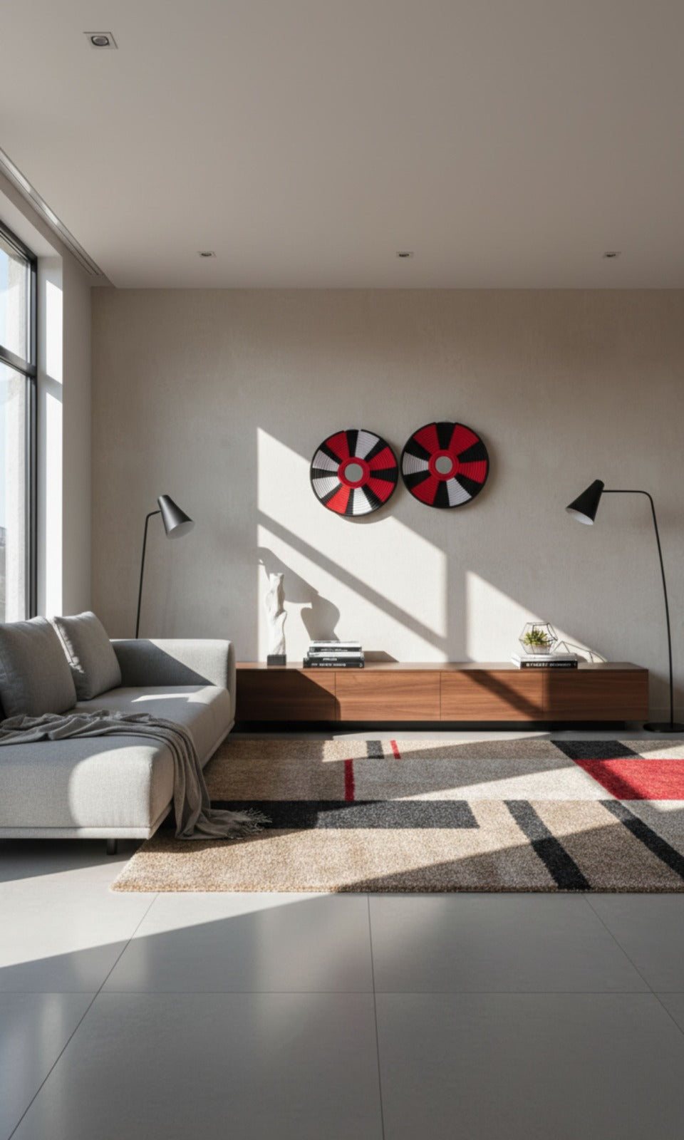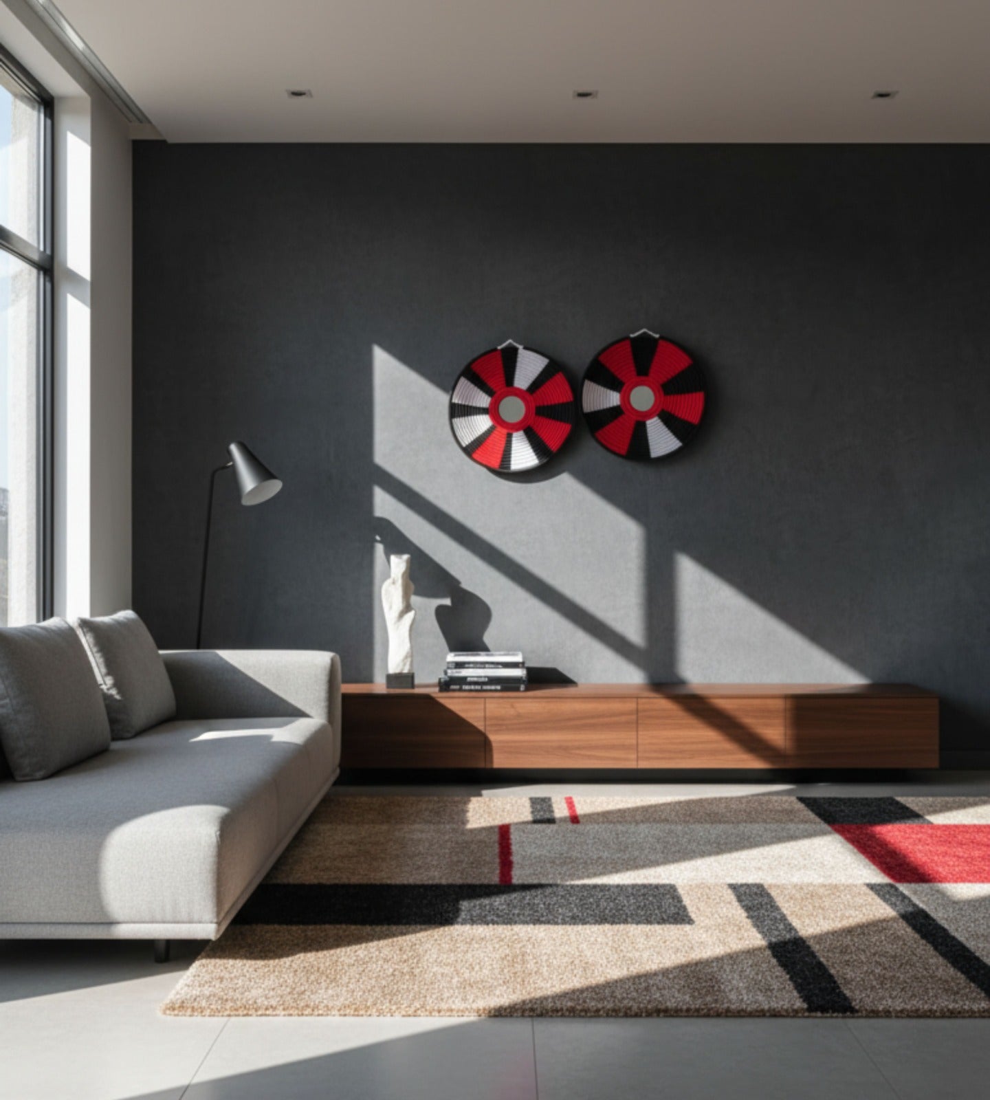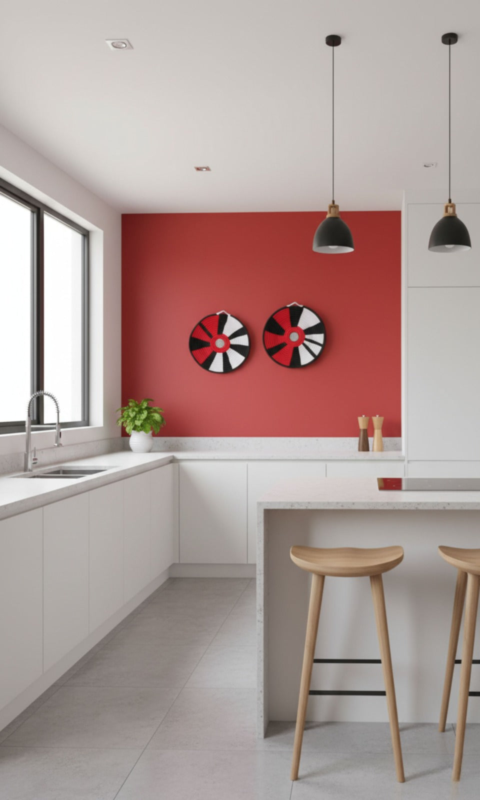 Transform your kitchen or rooms into a stylish and inviting space with this modern minimalist design. Featuring a striking red accent wall paired with sleek white cabinetry, natural wooden stools, and black pendant lights — this setup perfectly blends warmth and sophistication. The bold circular wall art adds a touch of personality, making it a perfect inspiration for contemporary homes or interior décor lovers.