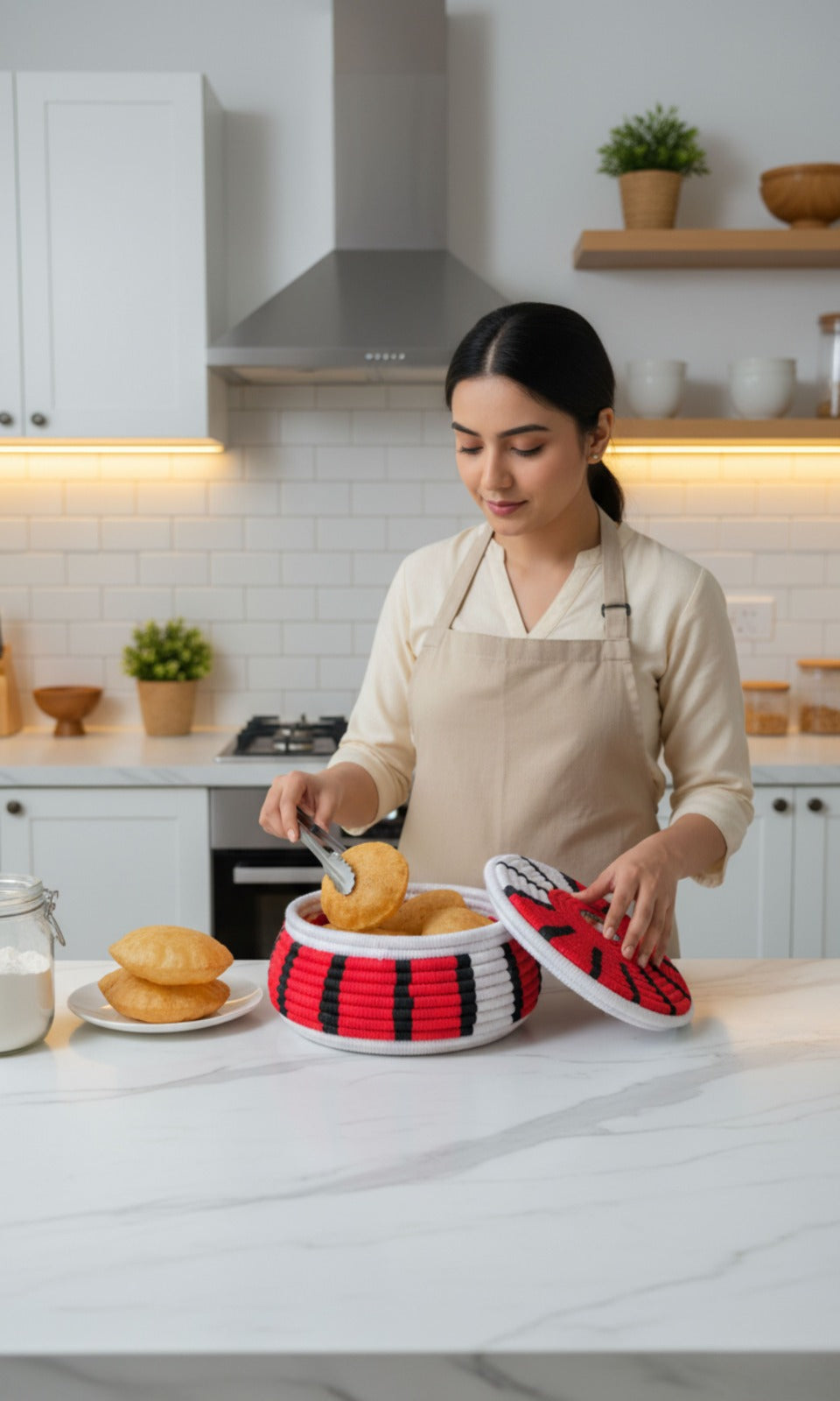 Keep your food warm and stylishly stored with this beautifully handwoven insulated hot pot. Designed to combine functionality with traditional artistry, it’s perfect for serving puris, rotis, parathas cookies, or any freshly cooked meal while maintaining their warmth for longer. The bold red, black, and white woven pattern adds a touch of cultural charm to your kitchen or dining table.