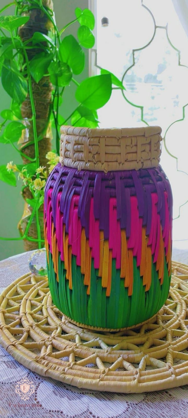 Bring natural elegance and vibrant artistry into your space with this stunning handwoven decorative vase crafted from date palm leaf. Designed by skilled artisans, this piece showcases a beautiful vertical weave with a rich blend of purple, pink, yellow, and green hues, finished with a natural palm rim for a refined, organic look.